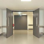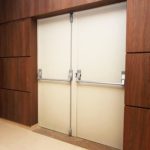 В двустворчатой конструкции используются два сплошных полотна шириной до 160 см. Эти двери предназначены для широких проемов. Они выдерживают открытое пламя и защищают помещение от вредных веществ, возникающих при горении.